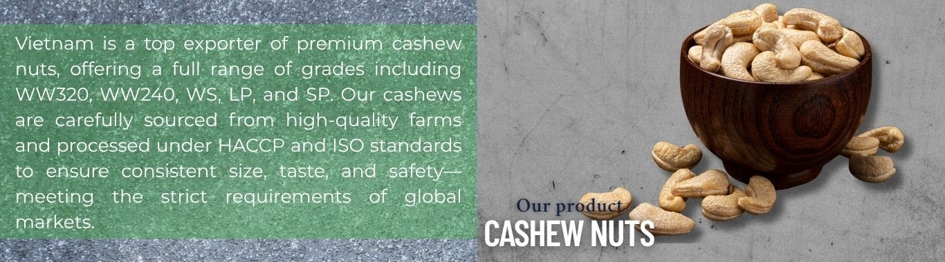 Agrifood Link VN is a trusted Vietnam cashew nuts supplier offering premium quality Cashew Nuts sourced directly from Vietnam’s leading growing regions. Our product range includes Cashew Nuts Raw Kernel (W180, W210, W240, W320, LP, SP) and Roasted Cashew Nuts (salted, unsalted, honey, chili, BBQ flavors). All cashews are processed under strict HACCP, BRC, ISO 22000, and organic standards, ensuring low aflatoxin, low moisture, and excellent kernel size uniformity. Perfect for snacking, confectionery, bakery, and export markets. Contact Agrifood Link VN for bulk supply of high-grade Vietnamese Cashew Nuts today.