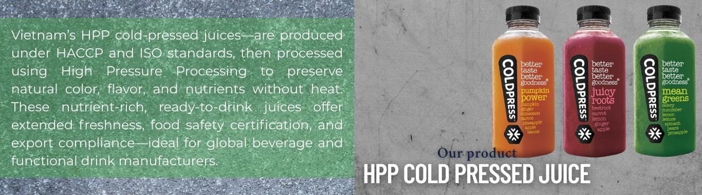 Discover premium HPP Cold Pressed Juices from Vietnam, expertly crafted by Agrifood Link VN. Using High Pressure Processing (HPP), these juices preserve maximum freshness, natural vitamins, enzymes, and vibrant flavors without heat or preservatives. Highlighting popular variants like HPP Water Melon Juice and HPP Passion Fruit Juice, our Vietnam-origin products deliver authentic tropical taste and superior nutrition for health-conscious consumers and beverage brands. Ideal for retail, foodservice, and wellness markets seeking clean-label, ready-to-drink juices.